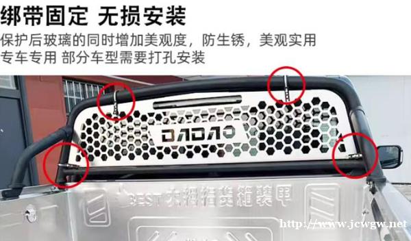江铃大道追光者皮卡车驾驶室后窗龙门架防护网防撞网,加厚不锈钢材质,原车开模,高温不变形,弹性好不生锈。整块板子冲孔而成,无拼接。绑带固定,无损安装。与龙门架搭配使用,防护驾驶室玻璃,提升颜值。