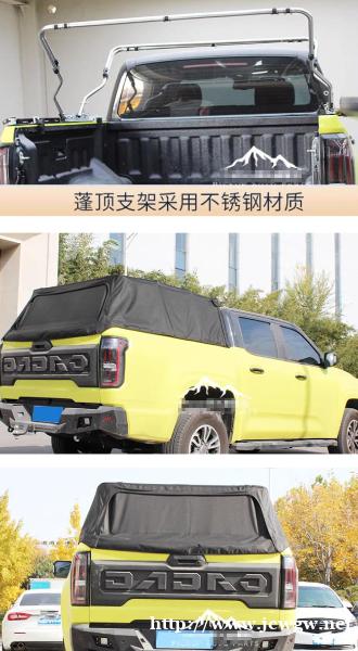 长城炮皮卡车货箱牛津布软高盖蓬布改装件,牛津布复合布材质制成,耐压折,防水防雨。骨架底板是加厚碳钢材质,蓬顶支架是不锈钢材质。固定夹扣采用铝合金材质,坚固。软高盖不用时,可折叠。带有魔术贴,拉链进行密闭加固,拆装方便。
