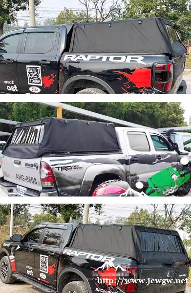 06至12年老款hilux海拉克斯vigo皮卡车软高盖改装件,牛津布复合布材质制成,耐压折,防水防雨。骨架底板是加厚碳钢材质,蓬顶支架是不锈钢材质。固定夹扣采用铝合金材质,坚固。软高盖不用时,可折叠。带有魔术贴,拉链进行密闭加固,拆装方便。