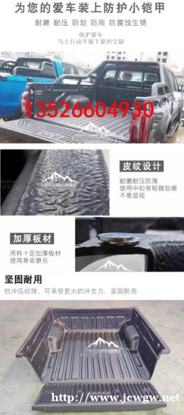 江淮悍途T9皮卡车标箱有轮包款货箱宝后箱垫子改装件,HDPE材质。采用原车**模设计,贴合度高。满焊工艺,美观又防水。具有抗压耐腐蚀,不易生锈等特点,可有效保护原车漆面。抗冲压纹理,坚固耐用。