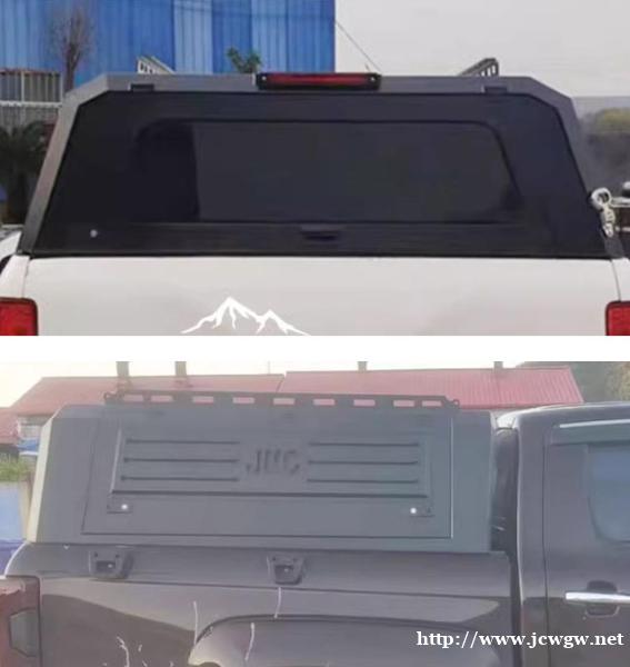 江铃域虎3/5/7皮卡车三开门后箱盖尾盖改装件,锰钢材质,整体打磨,结实耐用。全焊接设计,免打孔,固定卡扣安装。后盖均采用双侧液压撑杆,更方便省力。尾门,两侧窗均可打开。原车数据开模,吻合服帖。带锁防盗,带高位刹车灯。