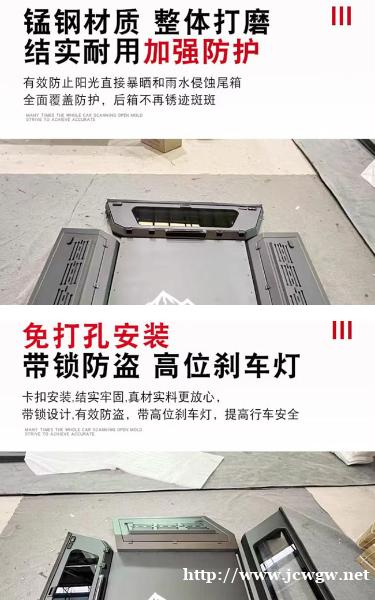 韩国双龙musson皮卡车三开门高盖后箱盖改装件,分体锰钢,铝合金材质可选,原车数据开模,贴合车身。整体打磨,结实耐用。液压升降窗盖,方便省力。免打孔安装,卡扣固定,带锁设计,有效防盗。带高位刹车灯,提高行车安全。