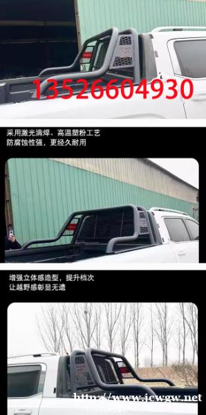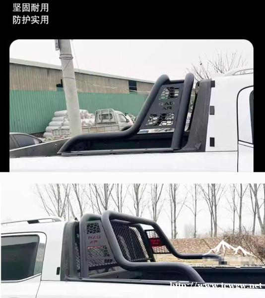 雷达RD5/RD6金刚新能源皮卡车龙门架防滚架护栏架子,镀锌铁管材质,采用激光满焊,高温喷粉工艺制成,防腐蚀性强,经久耐用。安装后增强车身立体感,提升档次,美观实用。贴合原车设计,打孔安装。
