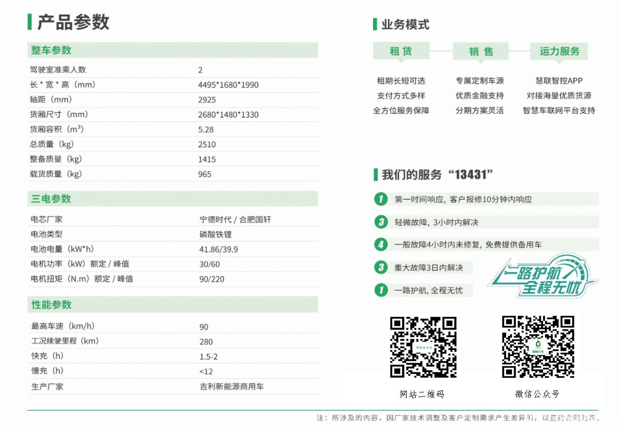 公司目前涵盖的新能源货车类型有“成功V2EA”,“陕汽轩德E9”, “厦门金龙”,“南京开沃”"东凤凯普特"“江铃凯锐””吉利远程E5L“等车型。新能源货车适用在批发配送、市内搬家、电商公司、运输车队等行业范围。新能源货车实现了不限行,不限号,无污染,低投入的优势。 公司有完善的售前,售后服务体系,用全面的技术态度为客户服务,解决客户车辆的所有需求,打造成让客户认可的一流汽车运营商。